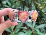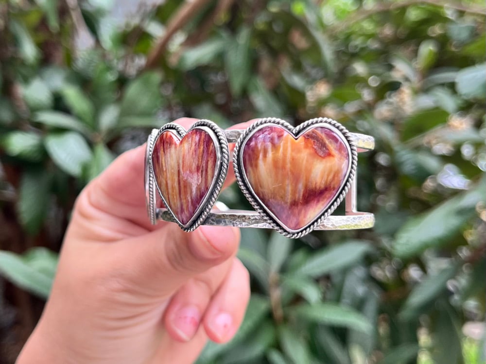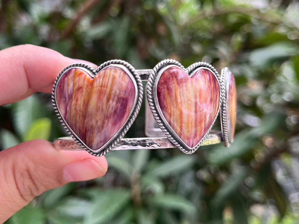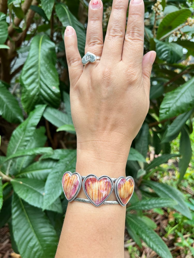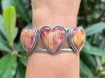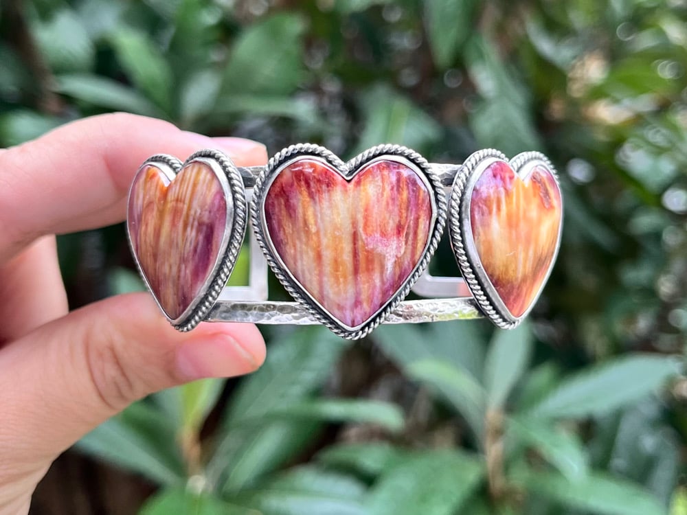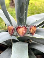Sterling Silver and Spiny Oyster 3 Hearts statement cuff. Measure 6” from end to end, would fit a 6.5-7” wrist perfectly.