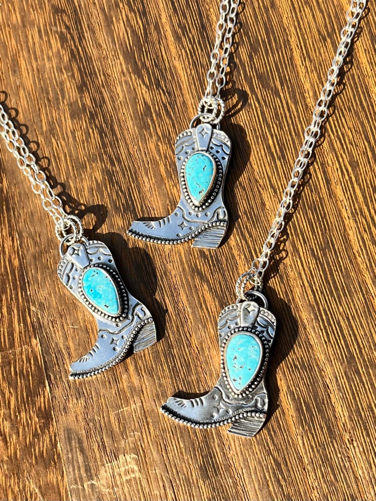 Handmade Sterling & Kingman Kicker Necklaces. The cute little shit kickers are hand fabricated from Sterling sheet and feature teardrop stabilized Kingman cabs. They measure 1”x1.5” and come on an 18” Sterling chain.