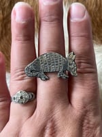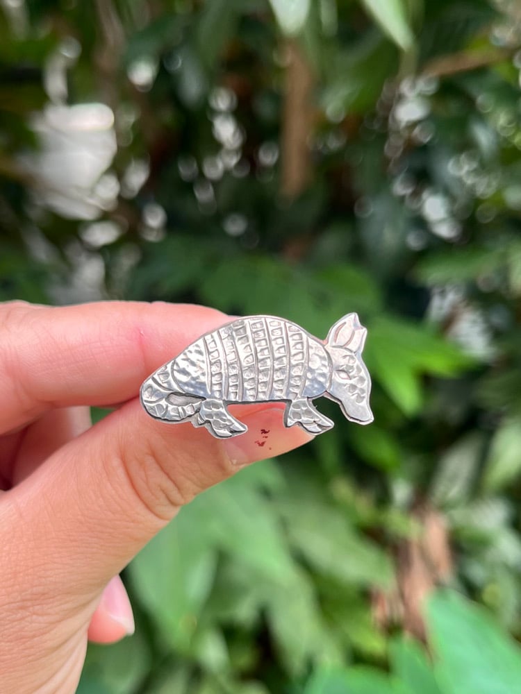 Handmade Sterling Silver Armadillo Rings. These little cuties measure 3/4” x 1 3/8”. Each one comes on a simple Sterling silver band.